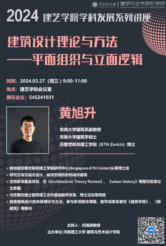 3月27上午,东南大学建筑系黄旭升副教授,通过腾讯会议在学院教工之家为学院师生开展关于建筑设计理论与方法——平面组织与立面逻辑的讲座,讲座由学院闫海燕教授主持。