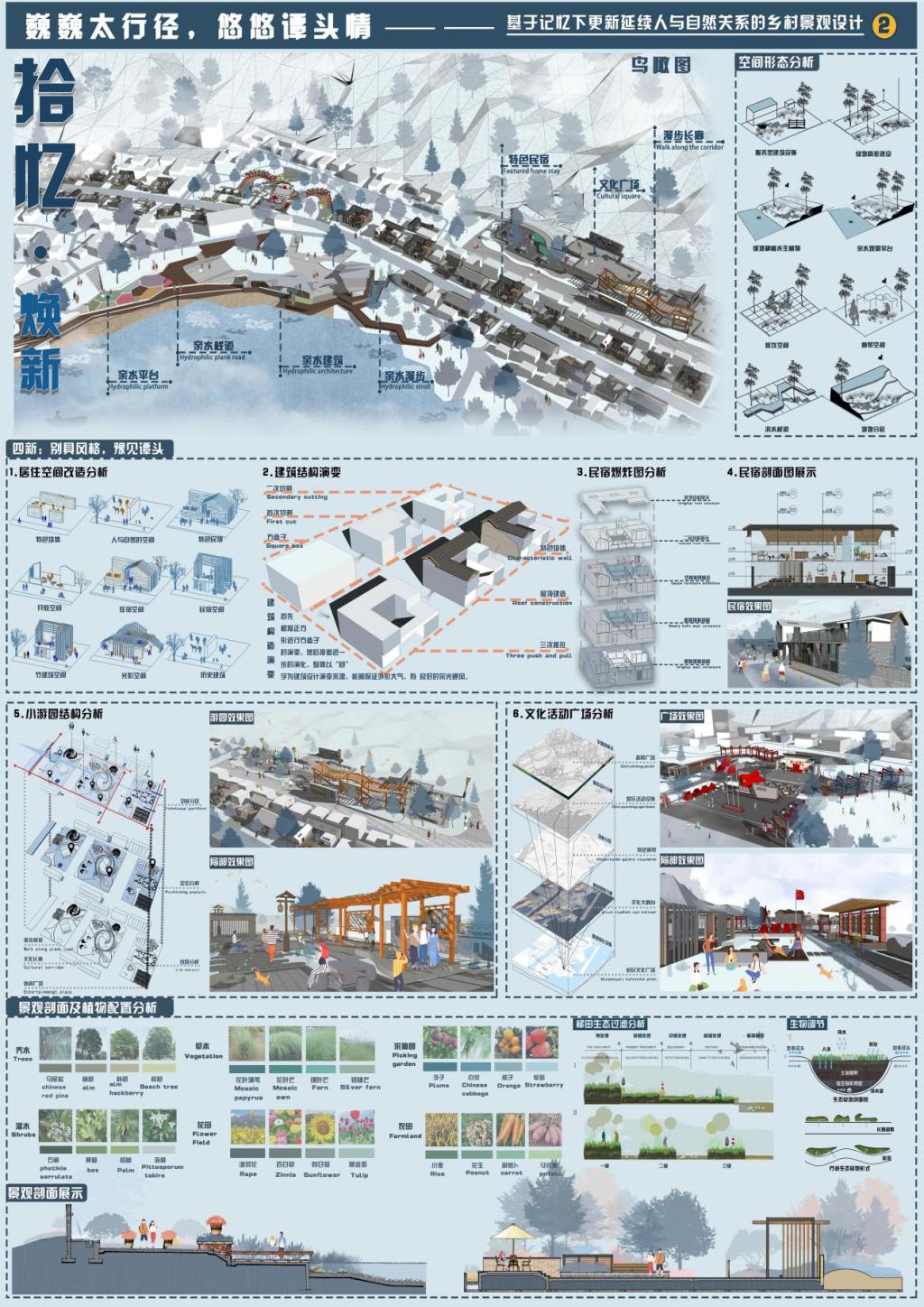樊泽鑫等三位同学的作品“沁古叠今——集璞舍”获得国赛二等奖,该作品基于韧性视角的乡村更新设计,以武陟县中封村文旅产业发展为例,以“璞”为主题,构建东方院落、寂隐生活。以“花生之乡,文化旅居”为核心,以宅院的形制,构建小亭与院落,顺应当下的生活方式,从衣食住行的生活方式中探寻文化旅居更多的可能性,结合当地民族文化实现韵味提升,在打造新旧融合的过程中保留本土韵味。