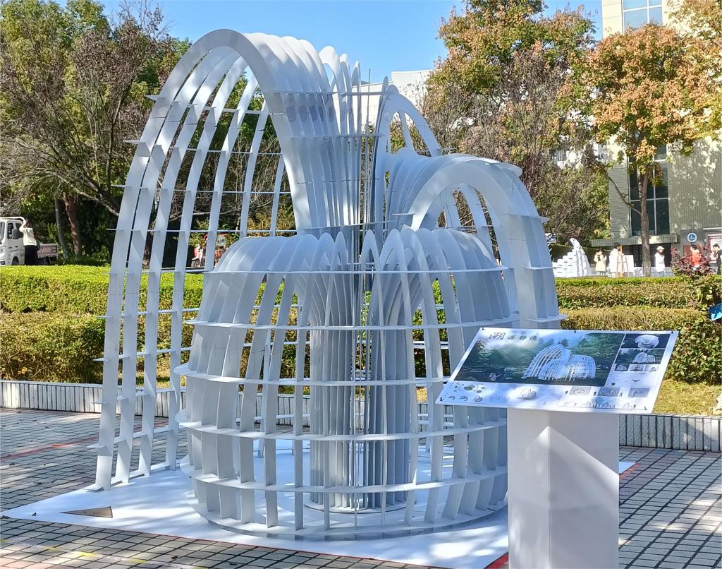 本次大赛以“原·巢”为主题,旨在营建一片能遮风挡雨的屋顶,可抵御自然变化对自身的影响,满足生命安全感和生活舒适感。参赛队员以白色“中空板”为材料进行实体搭建,需要在规定时间和空间内完成作品,充分考验了参赛选手的专业水平、动手能力、创新思维和团队协作能力。嘟嘟成人网 “春风有聚”队设计建造的溯源静逸作品获得一等奖。该作品由毕小芳、刘聪玲老师指导,作品表达了人类追溯往昔、立足当下、无愧未来的情怀。该作品因其宏大、新颖的立意,获得了多位专家教授的认可,在答辩环节中更是表现优秀,在多组参赛作品中脱颖而出“秋水相逢”队设计建造的《第二自然》获得三等奖,该作品由李海栋、庄昭奎老师指导。