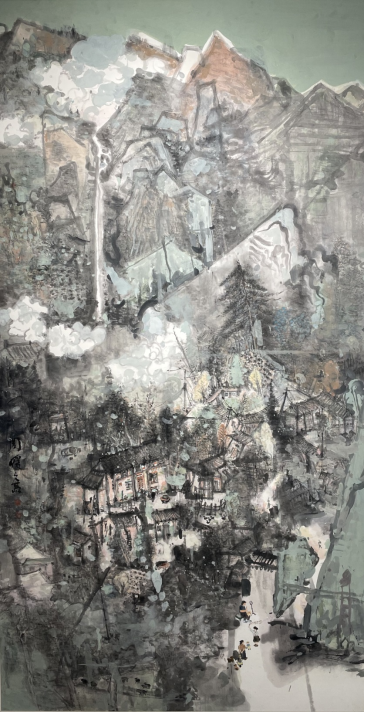 作品《云漫青山居隐图》立足中国写意画的本体特征与艺术传统,以写意精神为内核,在笔墨语言上深植传统渊源。画面中山峦通过皴擦表现肌理,云水借助晕染铺陈气韵,传承了“外师造化,中得心源”的古典美学追求,线条刚柔相济,墨色虚实相生,展现出传统笔墨的生动张力。同时,作品在立意与表现上融入了当代视野,体现出青年艺术家对写意绘画的现代思考与创新探索。