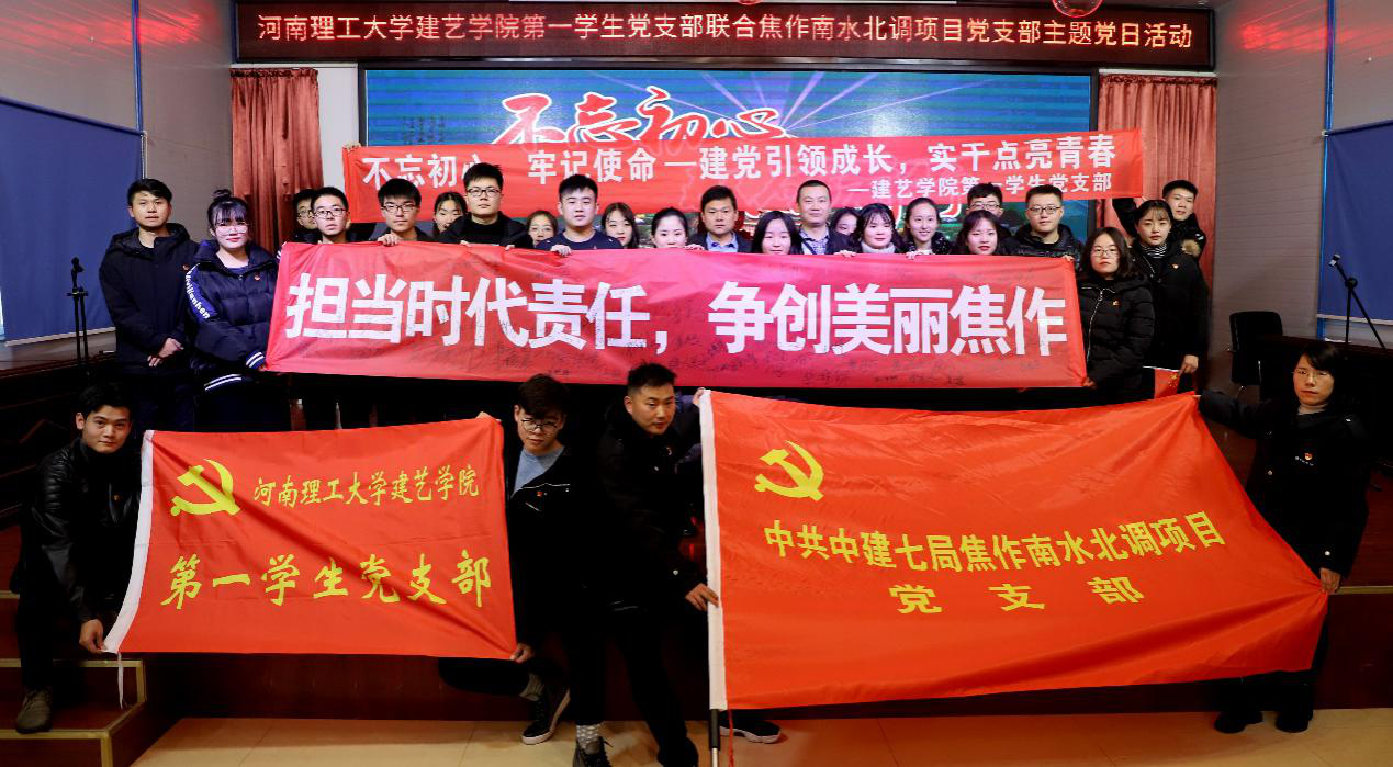 为贯彻学习习近平新时代中国特色社会主义思想和十九大精神,深入推进“不忘初心·牢记使命”主题教育,12月8日下午,学院第一学生党支部联合中建七局焦作南水北调项目党支部在其项目工程地顺利开展“党建引领成长·实干点亮青春”主题党日活动。学院第一学生党支部书记金欢、焦作南水北调项目部经理张学庆以及两个支部的60余名党员同志参加了此次活动。