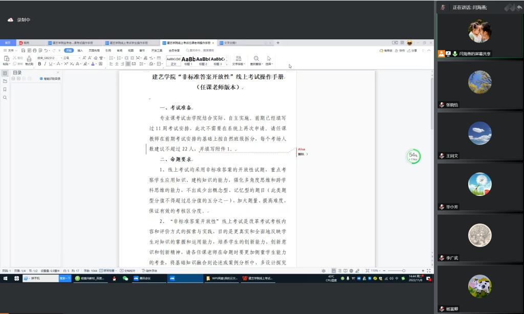 为了更好地高质量地推进“非标准答案开放性”线上考试工作,学院于2022年11月8号下午,召开了“非标准答案开放性”线上考试培训会,学院全体教职工参加了会议,会议采用线上形式进行,学院副院长闫海燕主持会议。
