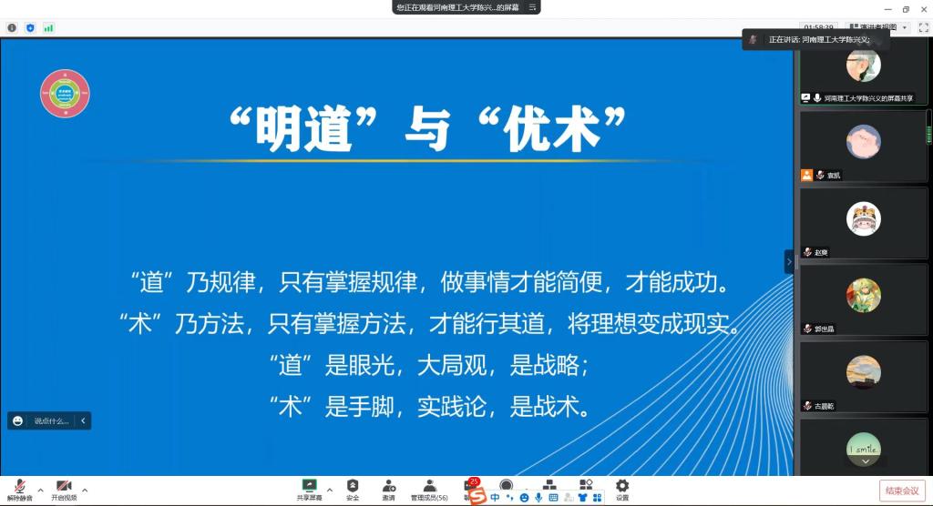 陈兴义教授就“道”与“术”的内涵与关系展开讨论,教导同学们学术研究的前提是要思路清楚,遇到问题时要“战略上藐视,战术上重视”,摆正心态积极面对。作为科研工作者,应该并重意识、思想、能力、精神四个方面,要肩负起文化传承的社会责任,同时具备实践与创新能力,不仅要有协作精神更要有工匠精神。在科学研究中我们要勤于调研、善于发现、敢于创新、锲而不舍。同时,陈兴义结合嘟嘟成人网