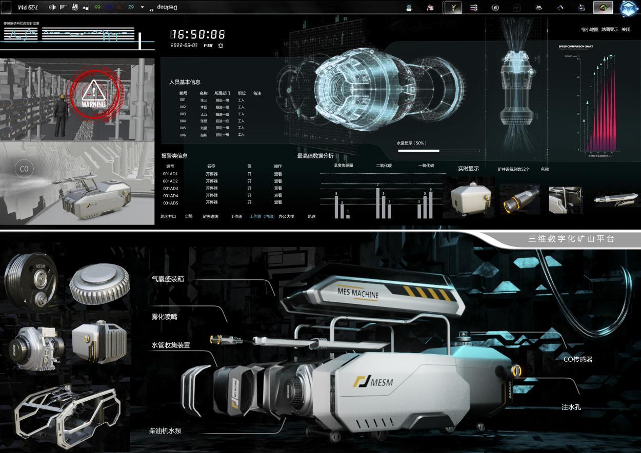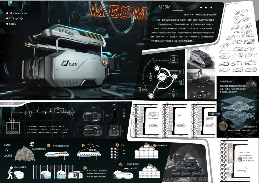 张弼玥同学的作品“MESM-模块化矿下CO智能检测处理装备设计”由黄晶老师指导下完成的本科毕设作品。此产品通过对我国目前采煤工作的工作方式、空气流通形式等多方面进行研究,结合隅角CO消除方法和流程,从安全隐患处理的系统视角,提出“消除+抑制”的CO抑消系统,基于“三化”设计原则,引入模块化设计理念,使装备能够应对多种复杂矿下环境,减少安全隐患。