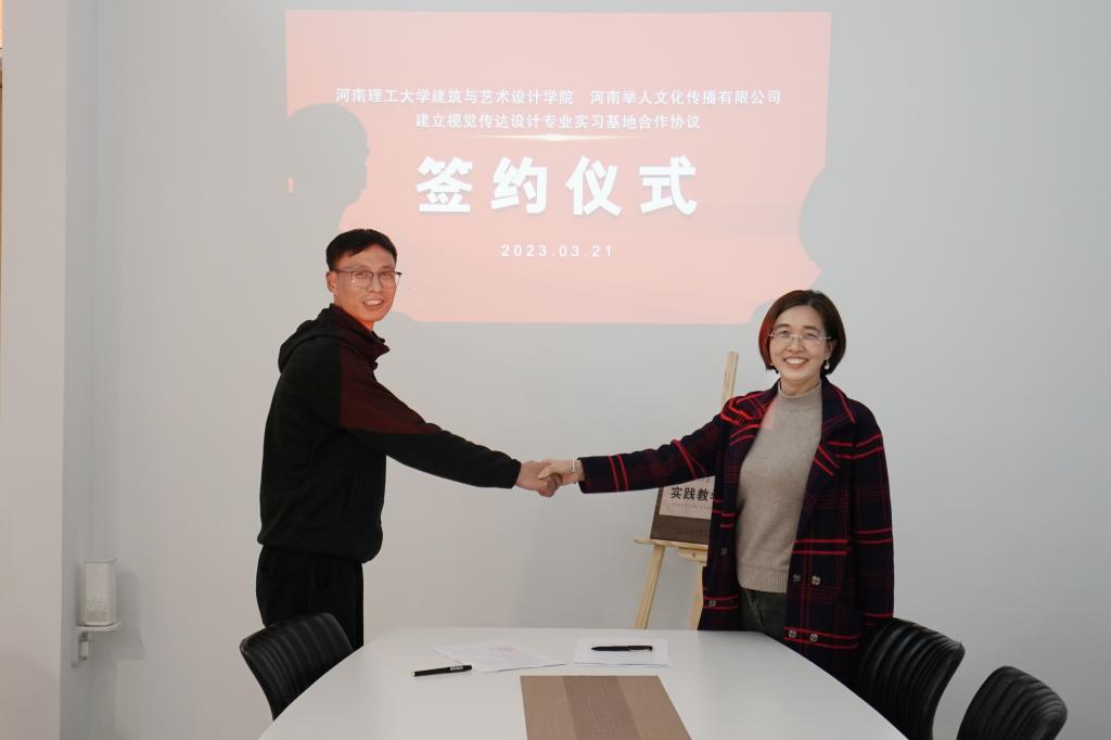 与河南举人文化传播有限公司举行实习基地签约仪式,院长王同文、副院长闫海燕、环境设计系主任王维天、视觉传达设计系主任王海、支部书记徐海涛、举人文化总经理毋千举出席签约仪式。