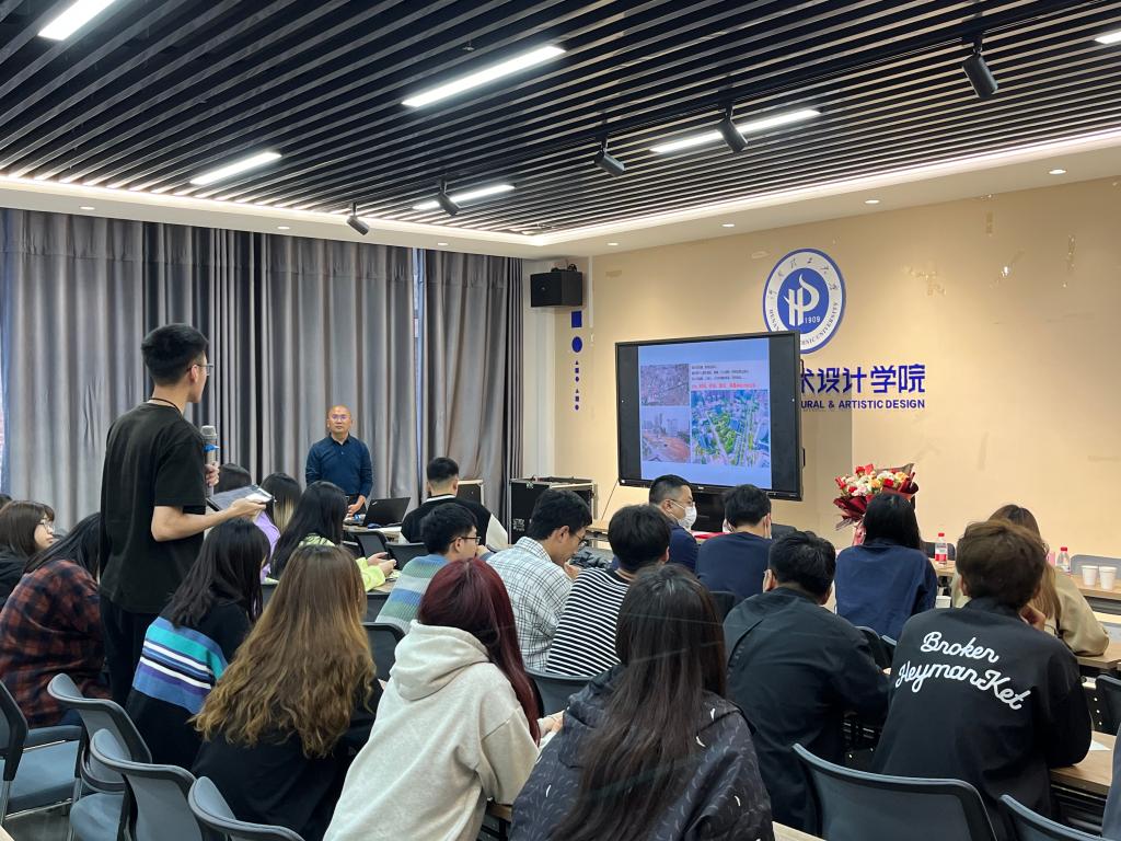 师生作了题为《时间·空间,变化的景观——东莞东城文化中心公园项目透视》的学术报告,岭南生态文旅股份有限公司华北区域运营中心总经理程新想、学院副院长韩宏斌及相关专业师生参加报告会,环境设计系主任王维天主持报告会。