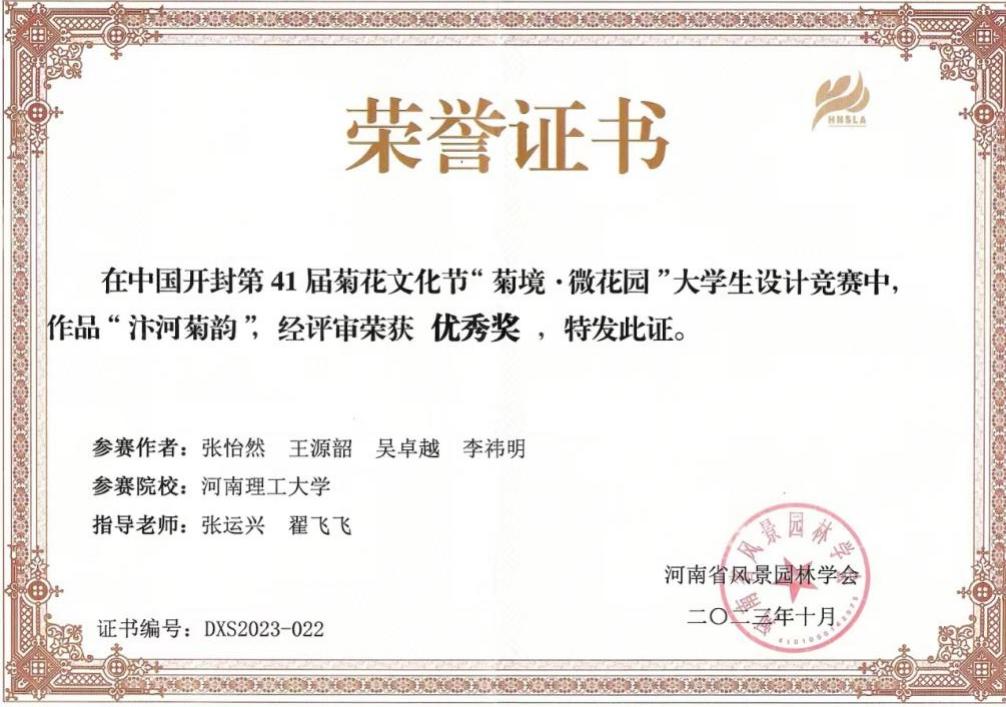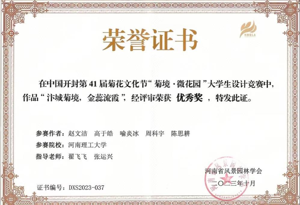 师生在该赛事获得的首次荣誉。获奖作品分别由张运兴、翟飞飞两位老师指导。《汴河菊韵》以小见大,彰显了开封地域文化特色和千年古都的迷人风韵,表现了中华民族乘风破浪、勇往直前的宏伟气魄,蕴含了祝福伟大祖国前程似锦、繁荣昌盛的赤子心愿。《汴城菊境·金蕊流霞》营造了永恒、宁静与热情的氛围,表达了人生要充满无限希望的主旨。