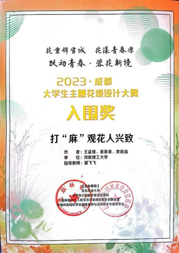2023年上半年,由北京林业大学等主办的“2023·成都大学生主题花境设计大赛”征集设计作品。全国105所高等与大专院校覆盖1082人的有效参赛作品449组。由翟飞飞老师指导的设计作品《打“麻”观花人兴致》荣获入围奖,是嘟嘟成人网