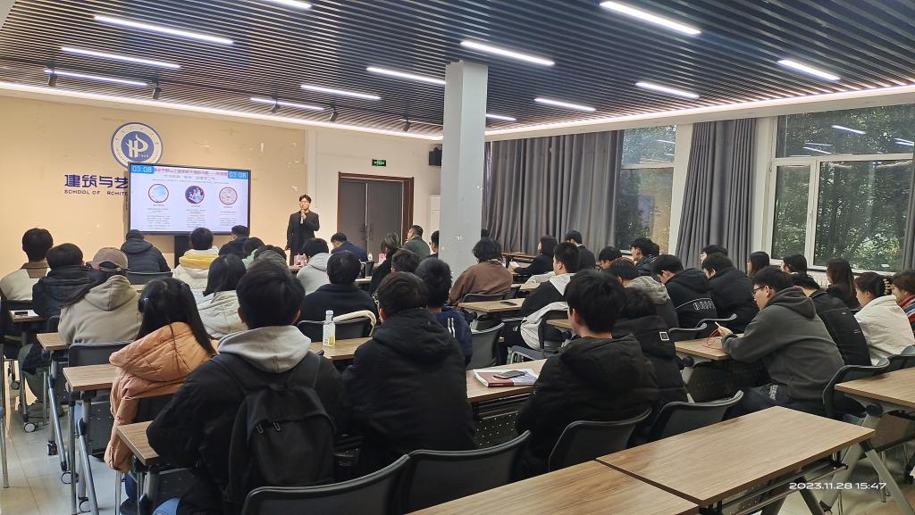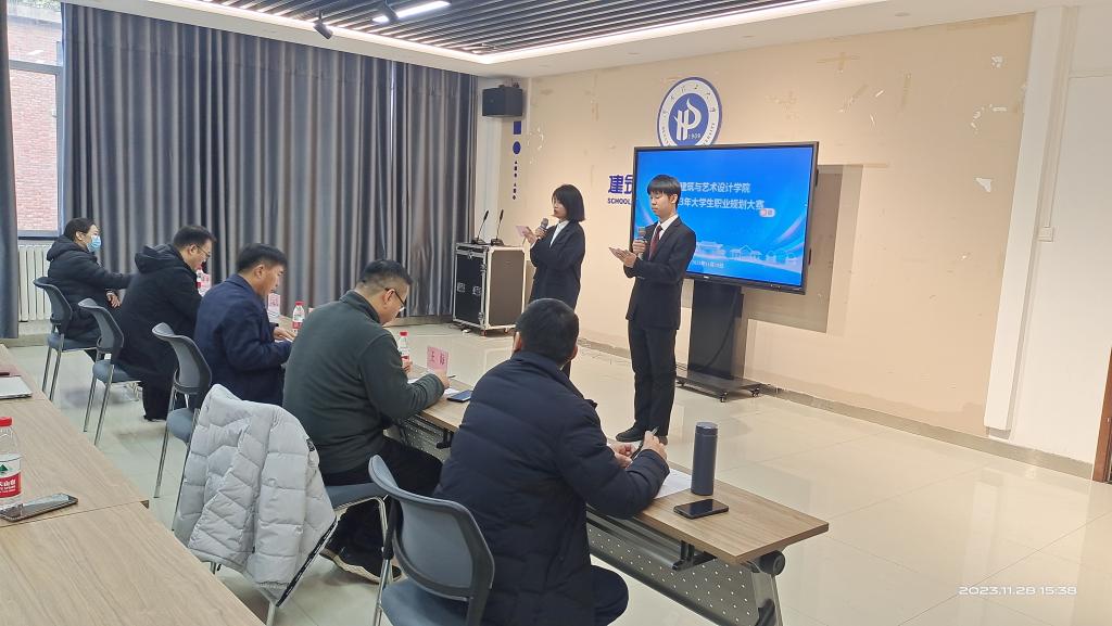 职业发展教育和就业指导,增强大学生生涯规划意识,促进毕业生高质量充分就业,11月28日下午,学院在晓书楼大会议室举办2023年“筑梦青春志在四方,规划启航职引未来”大学生职业规划大赛。院党委副书记张明、城市规划专业支部书记张运兴、视觉传达专业系主任王海、环境设计专业系主任王维天、工业设计专业系主任周敏作为评委老师出席了本次大赛。