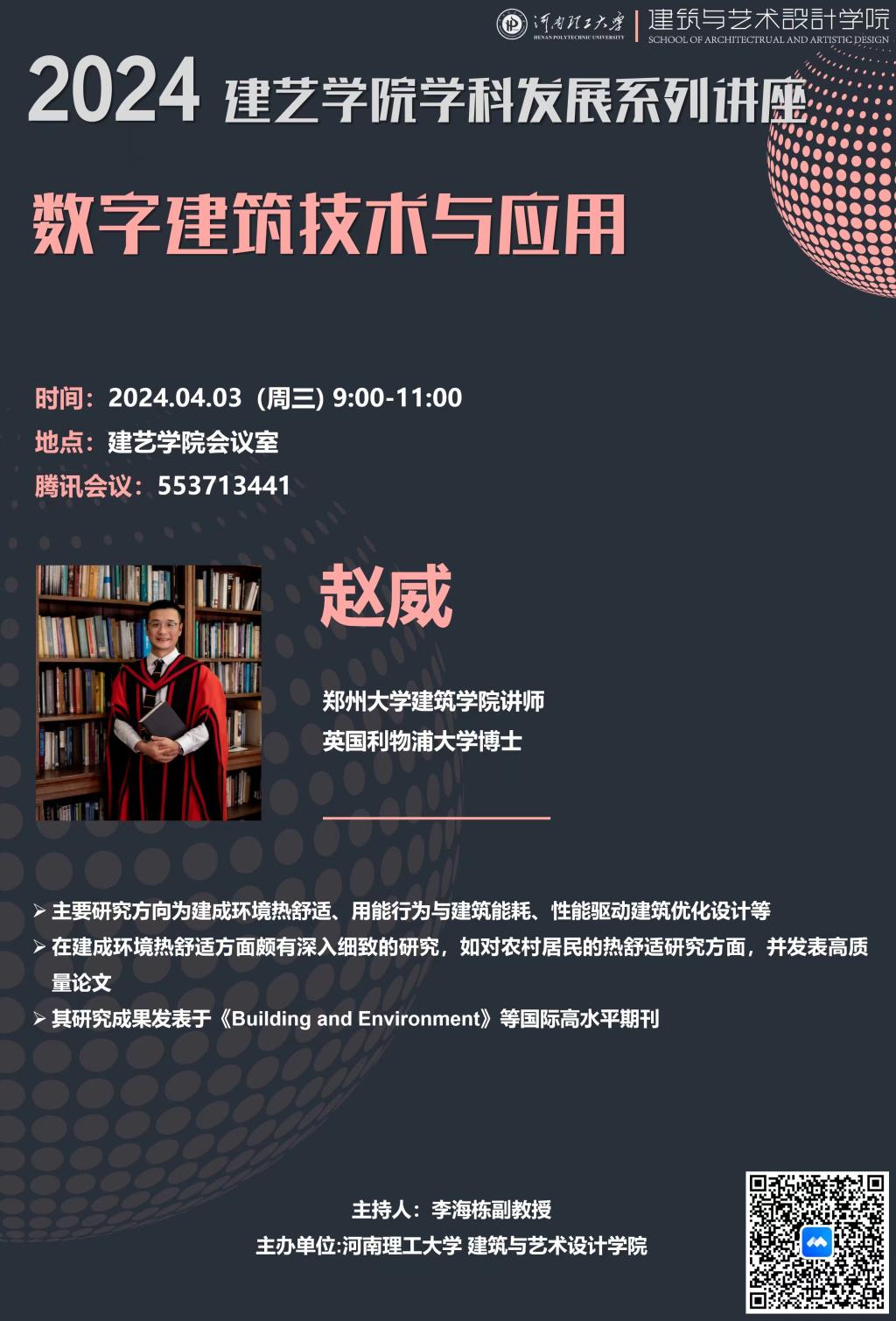 4月3日上午,英国利物浦大学博士、郑州大学建筑学院教师赵威通过腾讯会议在学院教工之家为学院师生开展“数字建筑技术与应用”的讲座,讲座由学院李海栋副教授主持。