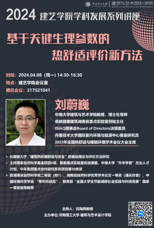 4月8日下午,东南大学刘蔚巍教授通过腾讯会议在学院教工之家为学院师生开展“基于关键生理参数的热舒适评价新方法”的讲座,讲座由学院闫海燕教授主持。