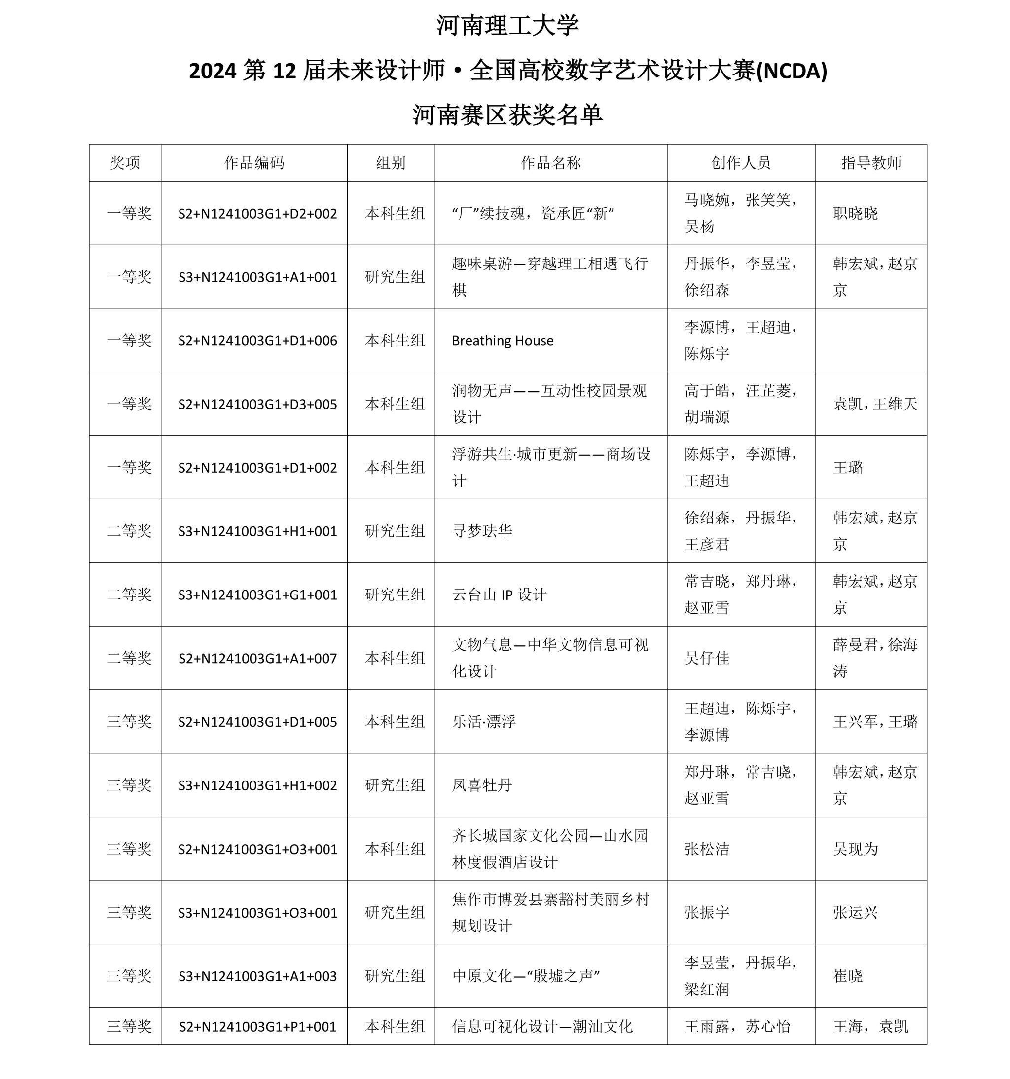 在本次大赛中,建艺学子表现突出,荣获全国总决赛二等奖2项、三等奖1项,以及河南省赛区一等奖5项、二等奖3项、三等奖6项的好成绩。韩宏斌、王璐、王维天、袁凯、赵京京和职晓晓六位老师荣获“优秀指导老师”称号。马晓婉、张笑笑、吴杨同学的《“厂”续技魂,瓷承匠“新”》荣获国赛二等奖,该项目旨在通过陶瓷三厂工业遗址的更新改造,在“文化+”理念下,充分利用其所具有的资源优势和特色文化,在保护其文化历史的同时,呈现以绞胎瓷文化为主题的旅游景区,打造绿色科技园区;丹振华、李昱莹、徐绍森同学的《趣味桌游—穿越理工相遇飞行棋》荣获国赛二等奖,该作品对校园建筑和特色风景进行插画处理,充分挖掘校园理念,设计出符合校园人文精神的游戏规则。玩家在游玩的过程中能够逐步摸清校园地图,触摸校风校训,能够在游玩的同时收获校园精神;李源博、王超迪、陈烁宇同学的《Breathing House》荣获国赛三等奖,该作品选择焦作平原光电旧厂区进行名为“古墟·新生”的工业遗产改造项目,旨在注入现代特色和活力。考虑文化和历史价值,以可持续发展为基础,采用被动处理技术改善室内环境。综合考虑城市工业发展、多元人群和功能需求,重新构思公共空间,保留原有古树和建筑,融入现代设计手法,创造多功能活动空间。