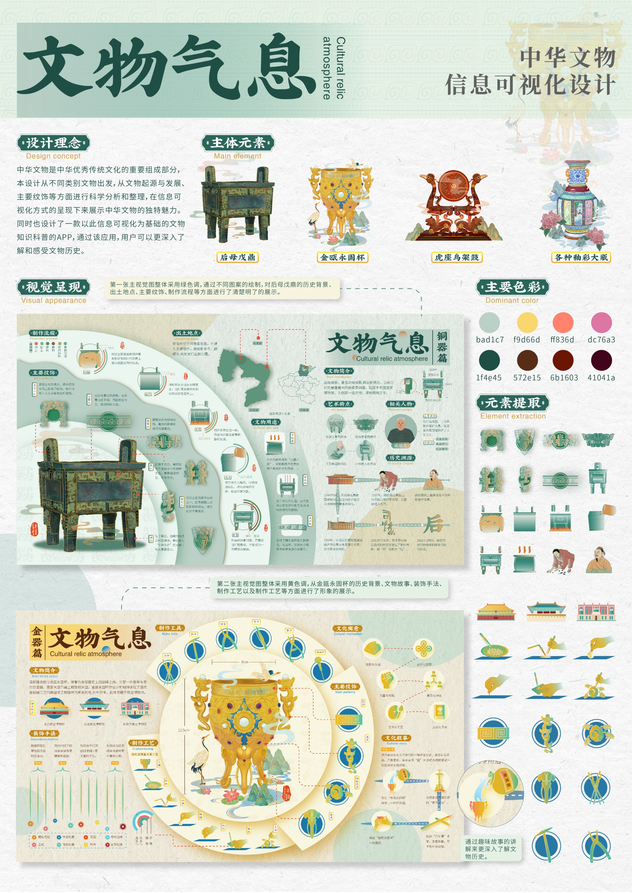 师生荣获包括国赛优秀指导教师奖、空间设计类二等奖、视觉传达类一等奖等多项荣誉。其中,王璐、薛曼君和徐海涛获得国赛优秀指导教师奖。在国赛普通高等院校赛道中,吴仔佳同学的《中华文物信息设计》获得视觉传达类一等奖,该设计以信息可视化的方式,深入展示中华文物的独特魅力,让观众快速直观地了解中国传统文化;李晓静同学的《夔-安阳市商场设计》获得空间设计类二等奖,作品巧妙融合当地青铜文化,以夔龙纹的“流动”为核心,打造一个多功能商场建筑。同时,在河南分赛区,李晓静和陈烁宇同学的《归园慢漫,悠见太行》荣获空间设计类二等奖;林姝洋和余子仪同学的《红军长征》获得红色主题类二等奖;李芷涵、李晓静、张笑笑同学的《回旋之间,别有洞天》获得空间设计类优秀奖。