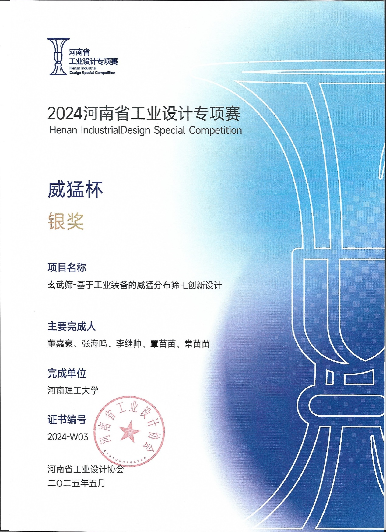 工业设计系/工业设计中心的精心组织下,由董嘉豪、张海鸣、李继帅、覃苗苗、常苗苗团队完成的“威猛杯”赛道方案《玄武筛-基于工业装备的威猛分布筛-L创新设计》《鹰扬筛-基于威猛复频筛-L外形与功能的创新设计》在众多参赛作品中脱颖而出,分别获得银奖和优秀奖,同时,我校获得大赛优秀组织奖、黄晶老师获得大赛优秀指导教师。