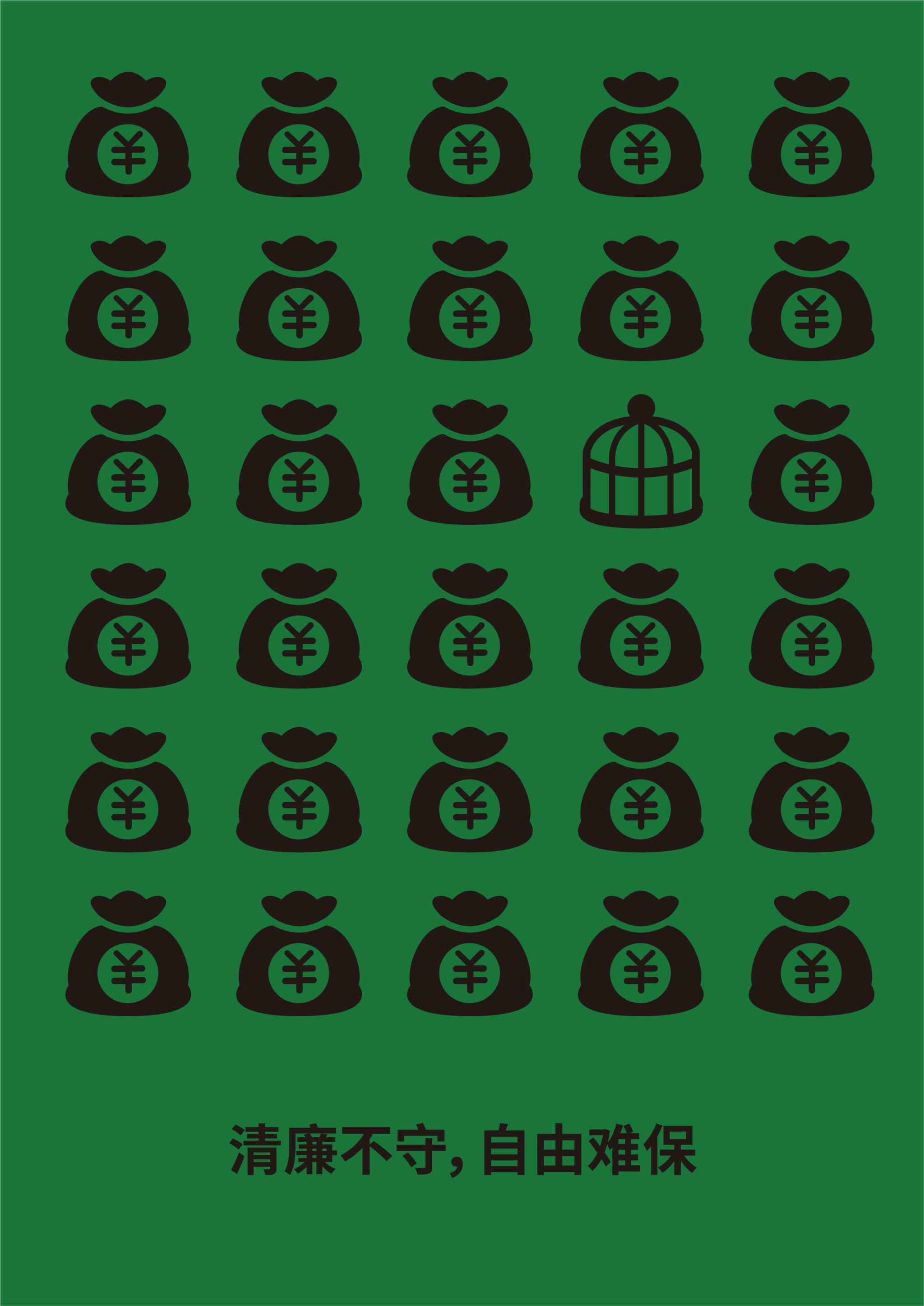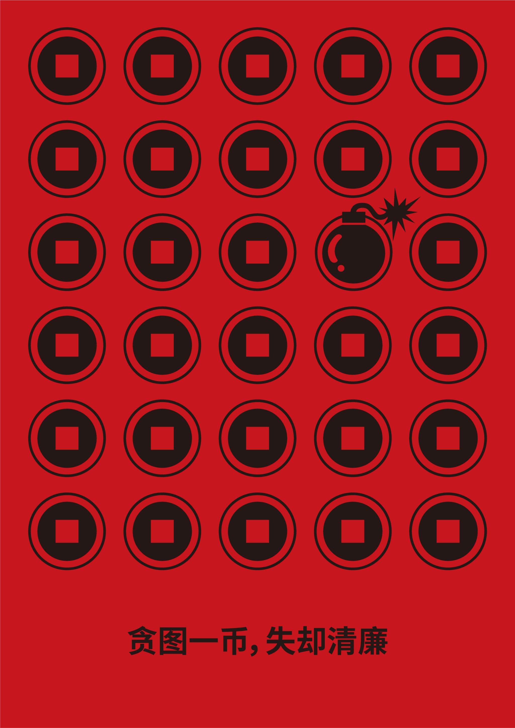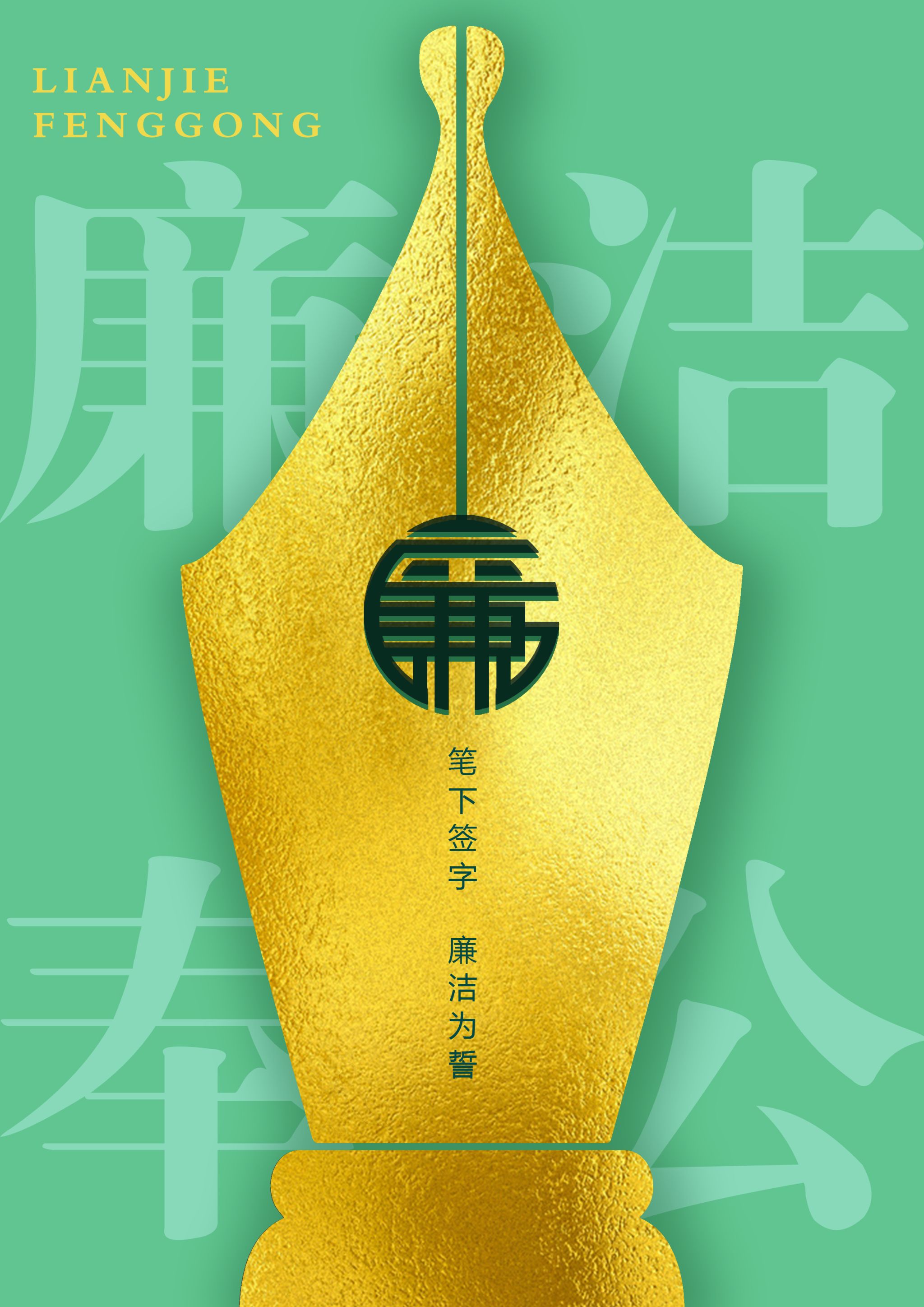 《字“廉”》以"廉"字为核心视觉符号,采用书法笔触与阵列结构构建廉洁精神图腾。廉字九宫格布局暗合传统九思之德,渐变金色笔锋象征高尚品格的淬炼过程。色调上整体采用翠绿与鎏金配色,再通过传统书法与现代构成融合,诠释"清正立身、廉洁为誓"的当代价值。《一念之差》通过重复构成、同形置换的设计形式,运用三种常见钱财符号——硬币、纸币、钱袋作为视觉主元素,表达“金钱表象之下,隐藏的危机后果”。画面简洁、秩序严谨,唯一的“异变”元素造成强烈视觉冲击与心理警觉,唤起人们对清廉的重视与思考,表达出清廉与贪腐,只在一念之间。《廉洁奉公》 以廉政为主题,以莲花作为主要视觉元素,旨在表达清正廉洁与高风亮节的深刻内涵。海报中的莲花莲蓬与公章造型进行巧妙结合,寓意着廉洁奉公的主题含义。