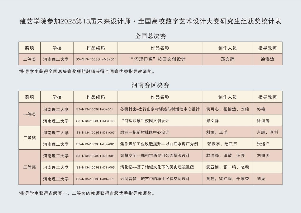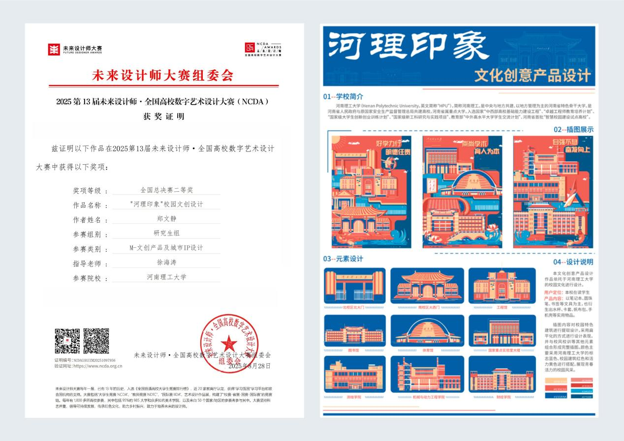 由徐海涛老师指导,设计学2024级研究生郑文静同学创作作品《"河理印象"校园文创设计》获全国总决赛二等奖。由佟艳老师指导,侯可心等的创作作品《冬桃村舍-太行山乡村驿站与村活动中心设计》荣获河南省赛一等奖。